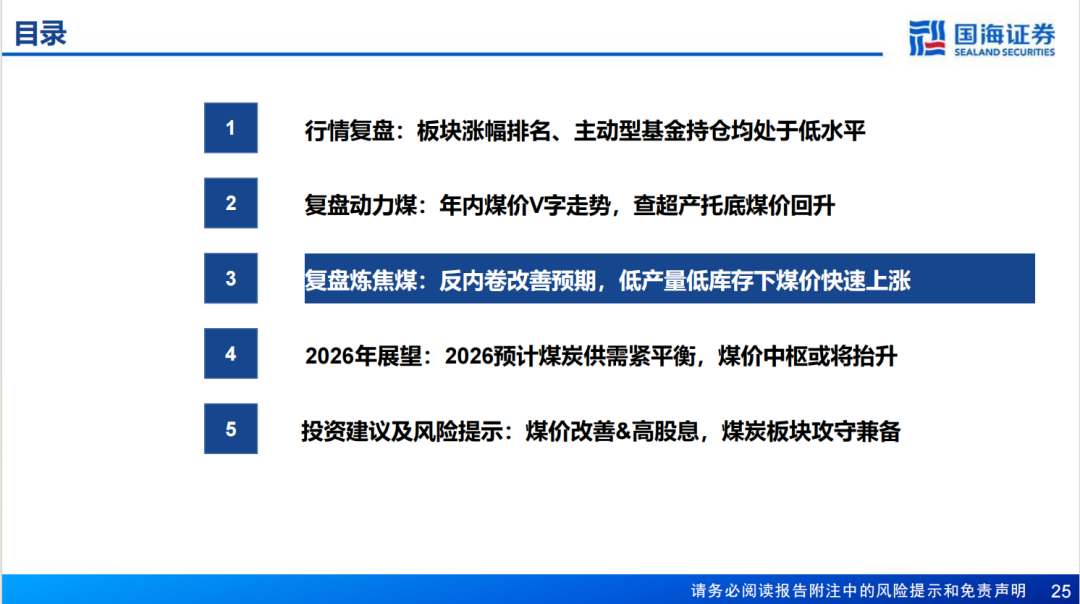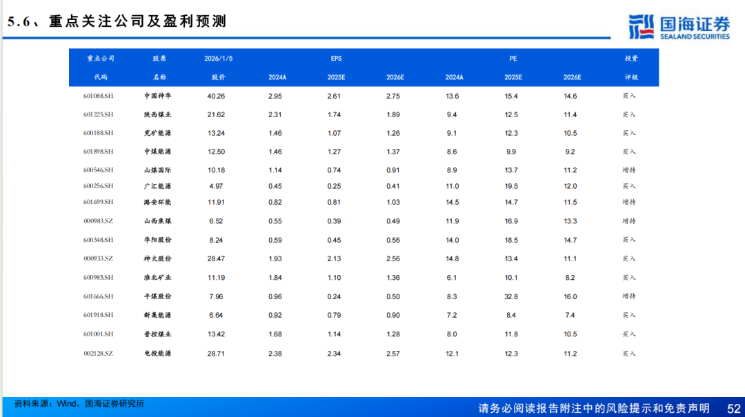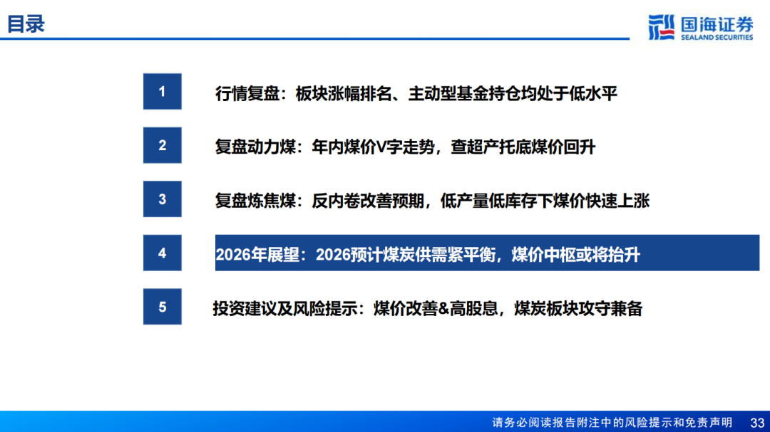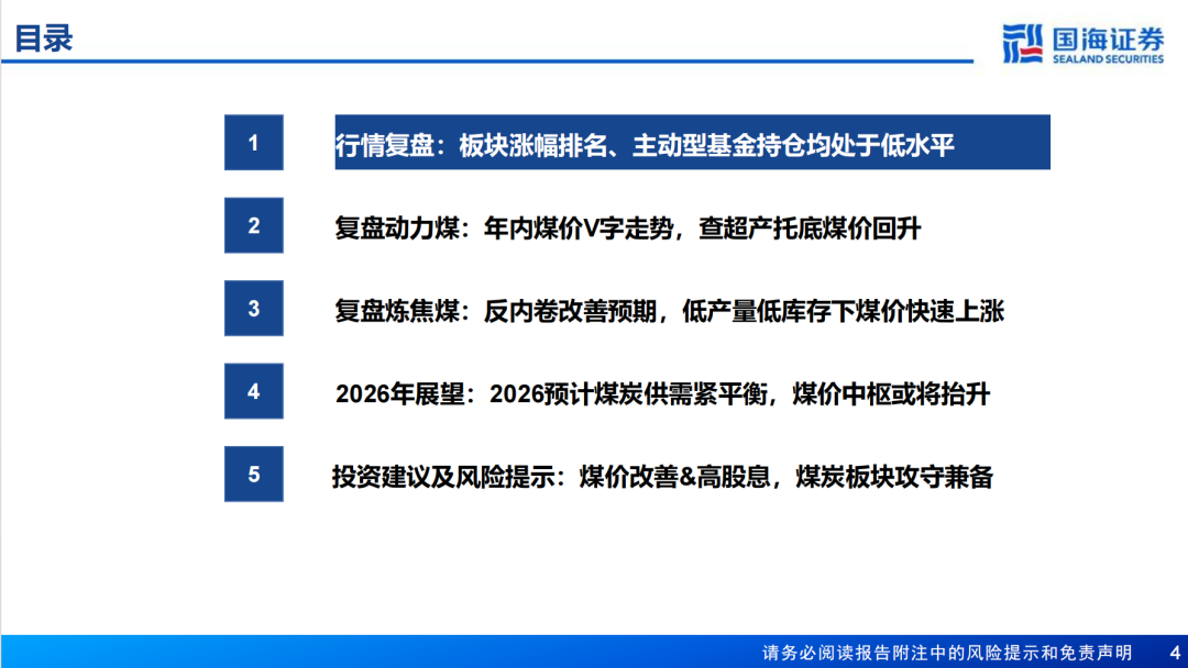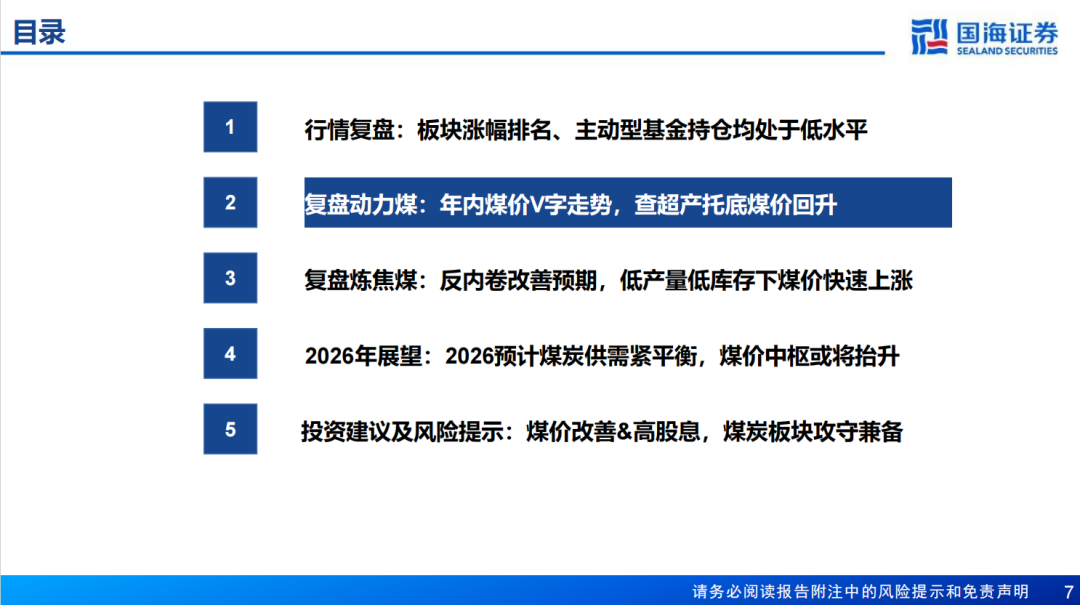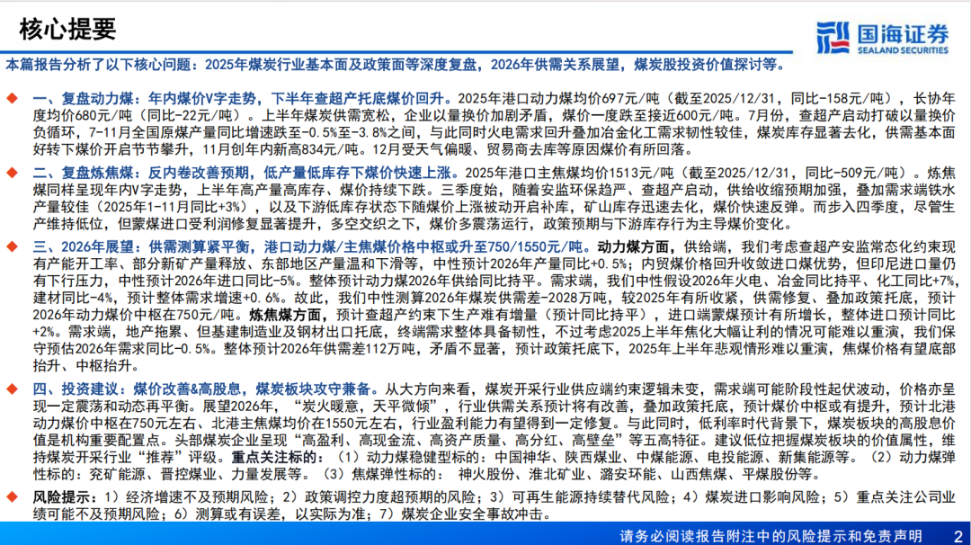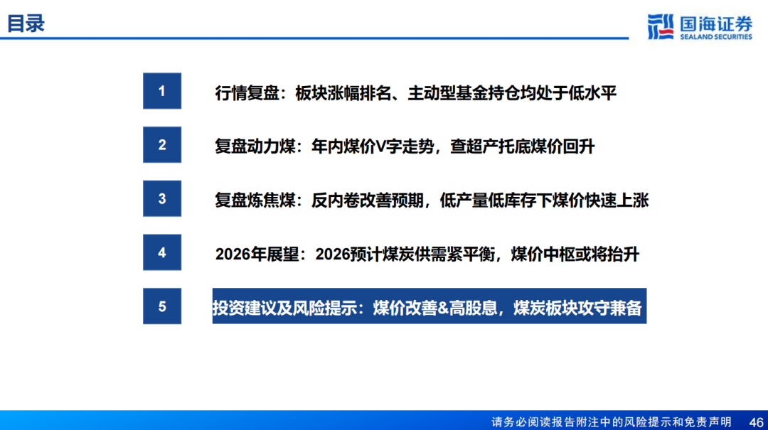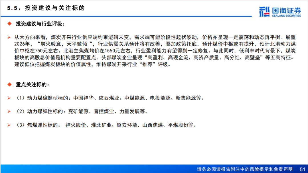 四、投资建议:煤价改善&高股息,煤炭板块攻守兼备。从大方向来看,煤炭开采行业供应端约束逻辑未变,需求端可能阶段性起伏波动,价格亦呈现一定震荡和动态再平衡。展望2026年,“炭火暖意,天平微倾”,行业供需关系预计将有改善,叠加政策托底,预计煤价中枢或有提升,预计北港动力煤价中枢在750元左右、北港主焦煤均价在1550元左右,行业盈利能力有望得到一定修复。与此同时,低利率时代背景下,煤炭板块的高股息价值是机构重要配置点。头部煤炭企业呈现“高盈利、高现金流、高资产质量、高分红、高壁垒”等五高特征。建议低位把握煤炭板块的价值属性,维持煤炭开采行业“推荐”评级。重点关注标的:(1)动力煤稳健型标的:中国神华、陕西煤业、中煤能源、电投能源、新集能源等。(2)动力煤弹性标的:兖矿能源、晋控煤业、力量发展等。(3)焦煤弹性标的: 神火股份、淮北矿业、潞安环能、山西焦煤、平煤股份等。