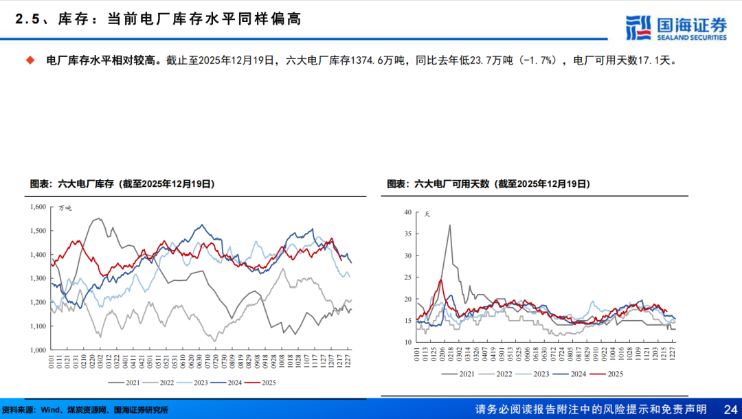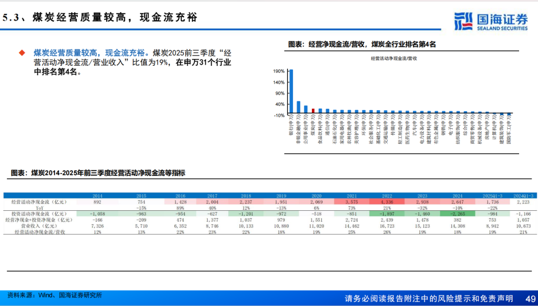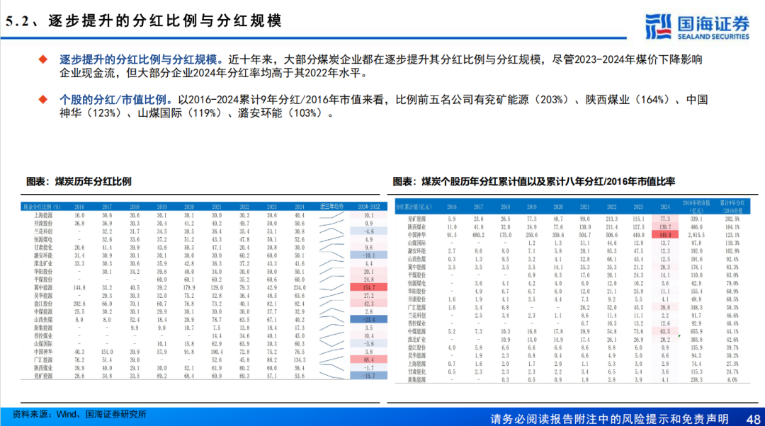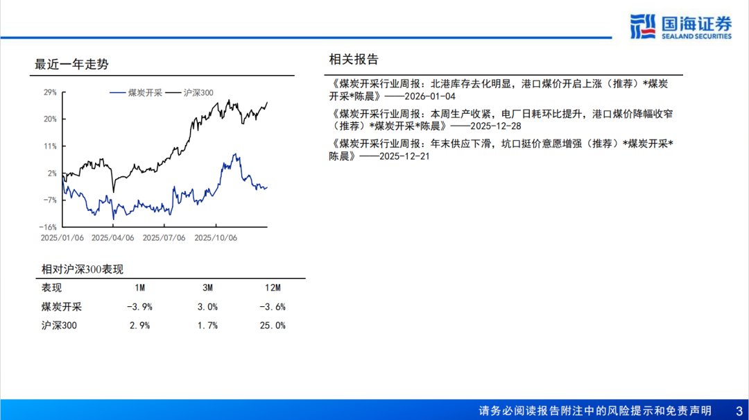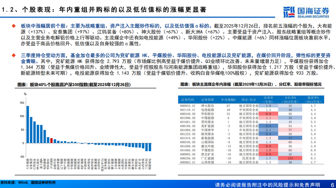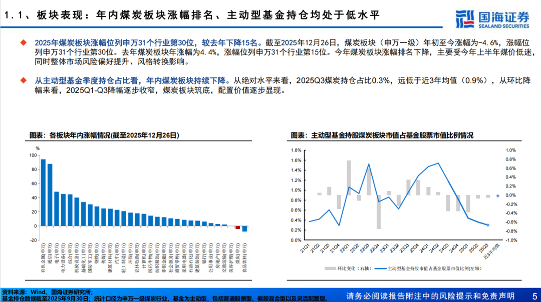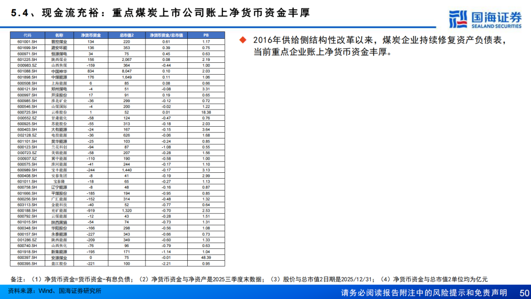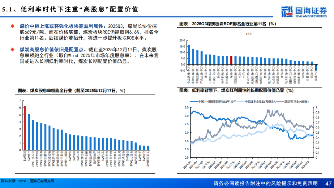 四、投资建议:煤价改善&高股息,煤炭板块攻守兼备。从大方向来看,煤炭开采行业供应端约束逻辑未变,需求端可能阶段性起伏波动,价格亦呈现一定震荡和动态再平衡。展望2026年,“炭火暖意,天平微倾”,行业供需关系预计将有改善,叠加政策托底,预计煤价中枢或有提升,预计北港动力煤价中枢在750元左右、北港主焦煤均价在1550元左右,行业盈利能力有望得到一定修复。与此同时,低利率时代背景下,煤炭板块的高股息价值是机构重要配置点。头部煤炭企业呈现“高盈利、高现金流、高资产质量、高分红、高壁垒”等五高特征。建议低位把握煤炭板块的价值属性,维持煤炭开采行业“推荐”评级。重点关注标的:(1)动力煤稳健型标的:中国神华、陕西煤业、中煤能源、电投能源、新集能源等。(2)动力煤弹性标的:兖矿能源、晋控煤业、力量发展等。(3)焦煤弹性标的: 神火股份、淮北矿业、潞安环能、山西焦煤、平煤股份等。