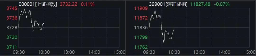 开盘后三大指数冲高回落,深证成指、创业板指一度翻绿。