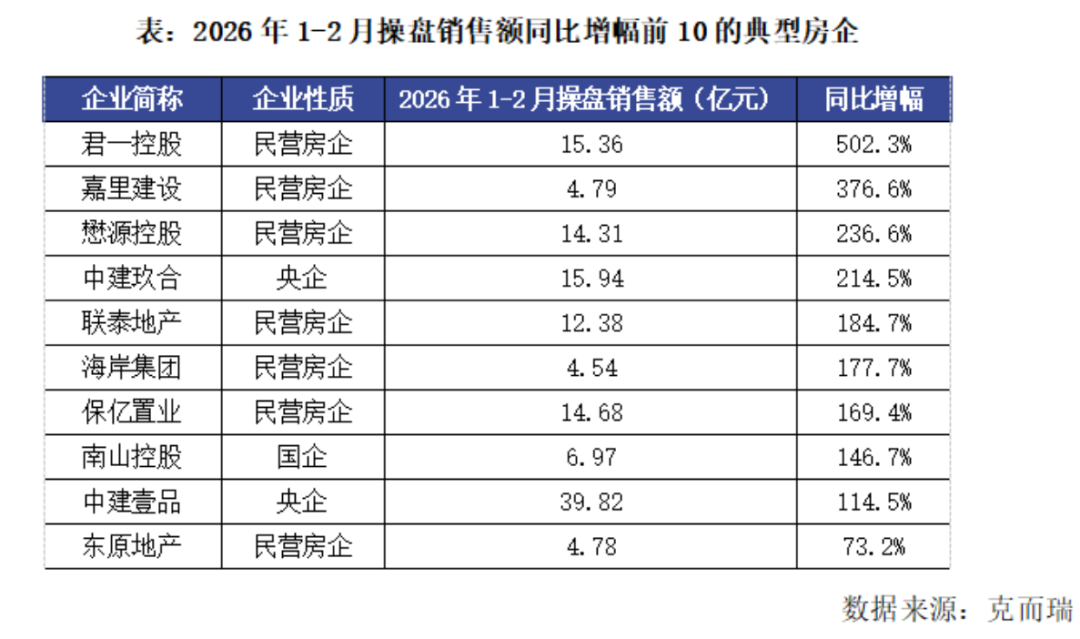 其中,民营房企君一控股前两月累计销售操盘金额15.36亿元,同比大增502.3%,同为民企的嘉里建设和懋源控股,也均实现翻倍及以上增长,同比增幅分别达376.6%、236.6%。