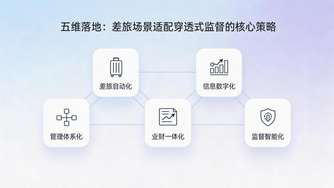 以差旅业务场景为切入点,企业需从管理体系化、差旅自动化、业财一体化、信息数字化、监督智能化五个维度推进落地工作,将穿透式监管要求融入差旅报销全流程,既实现场景内的合规管控,也为企业全域穿透式监管落地积累实践经验。