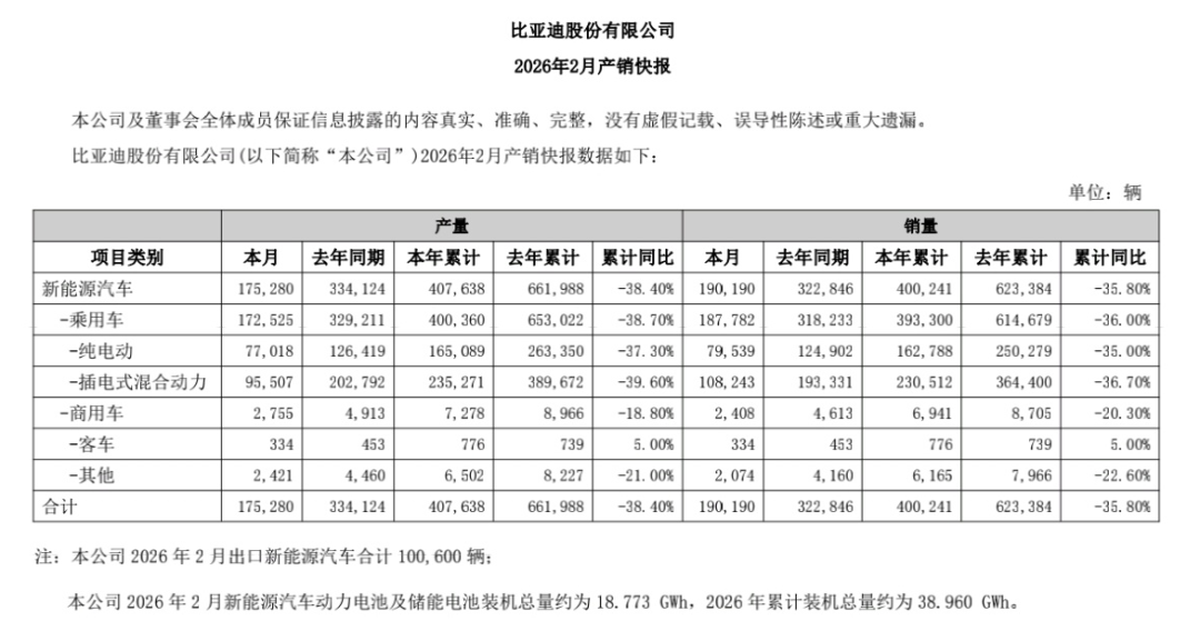 据储能知家获悉,3月2日,比亚迪披露2026年2月产销快报。其中,新能源汽车动力电池及储能电池装机总量约为18.773GWh,同比增长12.45%;2026年累计装机总量约为38.96GWh,在整体产销下滑背景下仍保持增长势头。