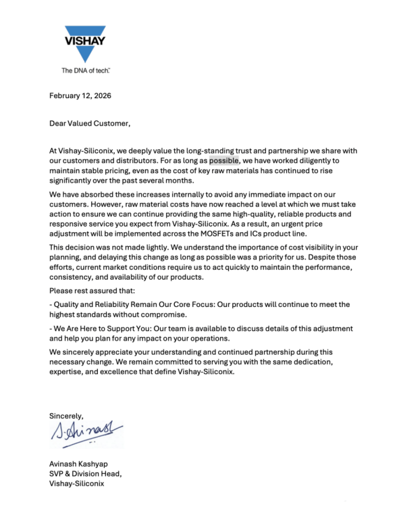 全球分立半导体与无源元件龙头Vishay亦传出涨价消息。因关键原材料成本持续大幅攀升,公司将对MOSFET 及 IC 产品线实施紧急价格调整,以缓解成本压力、保障供应稳定。