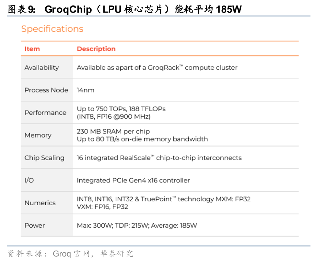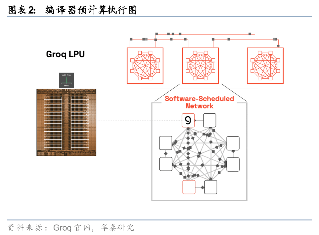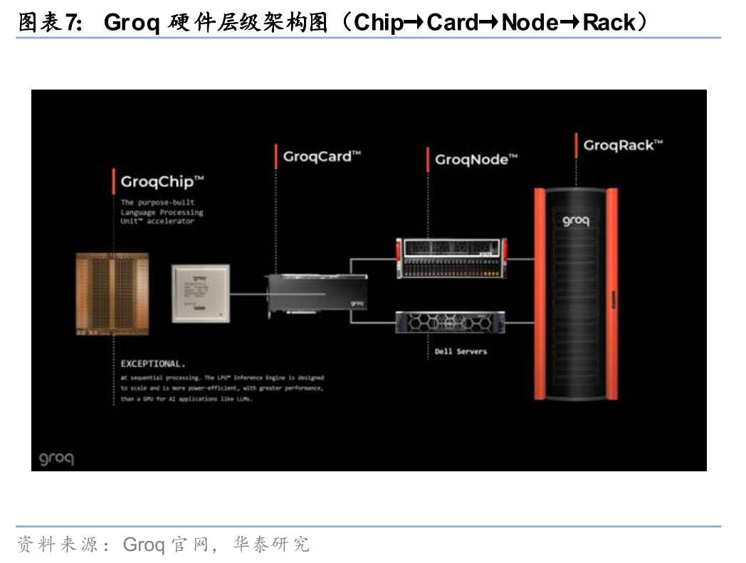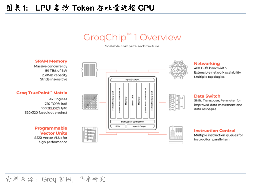 Groq的核心产品是全球首个专为推理设计的LPU(Language Processing Unit,语言处理单元),基于SRAM的确定性架构,片上带宽高达80TB/s,无缓存等待,实现极低延迟 高能效,专攻实时token生成(Groq称远超GPU在推理场景的表现)。