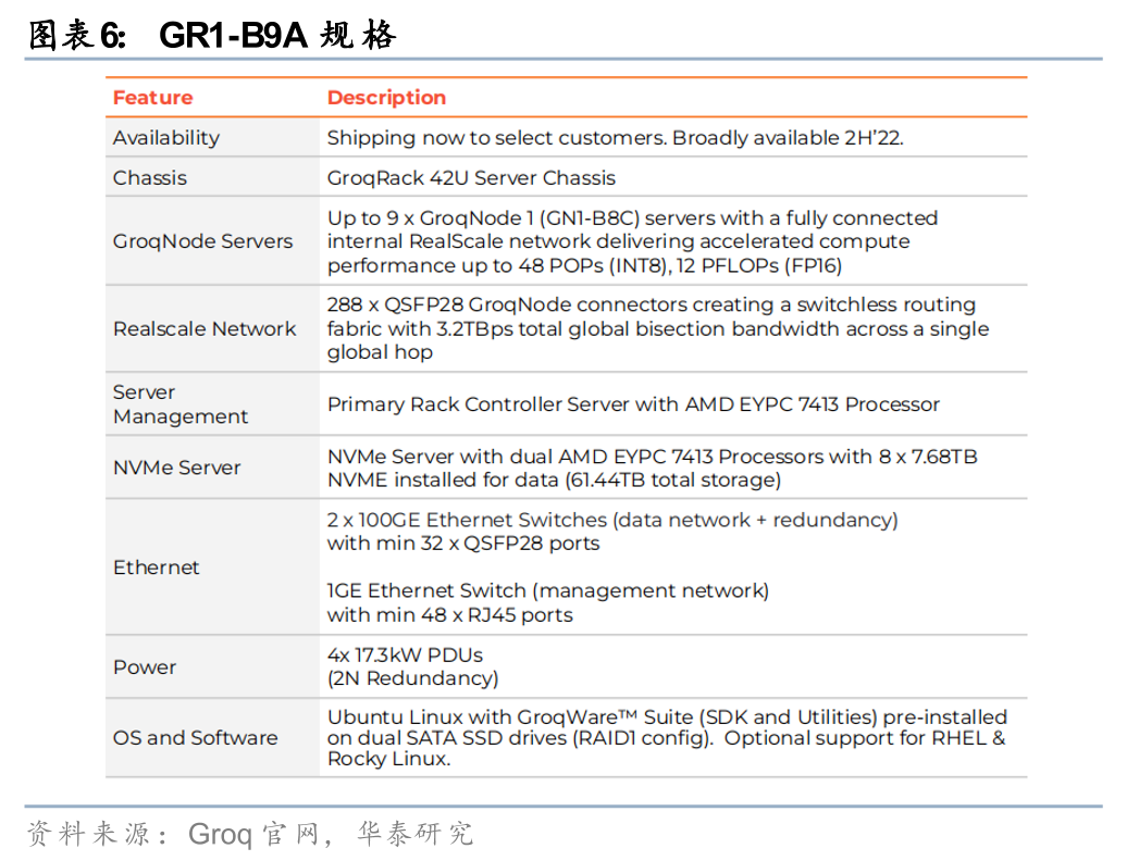 LPU的硬件形态此前明确采用机柜(Rack)部署,类似英伟达GB200/GB300超节点形式,需要额外的Scale-up互联才能形成超大规模推理集群。Groq官方为开发者直接提供GroqRack作为on-prem机柜选项(适用于监管行业或air-gapped环境),开发者可无缝从云切换到本地部署。单Rack标准配置为8个节点(共64个LPU/TSP) 1个冗余节点(防意外停机),最大系统可扩展至145个Rack(超10,000芯片级),形成真正的Rack-scale超节点。