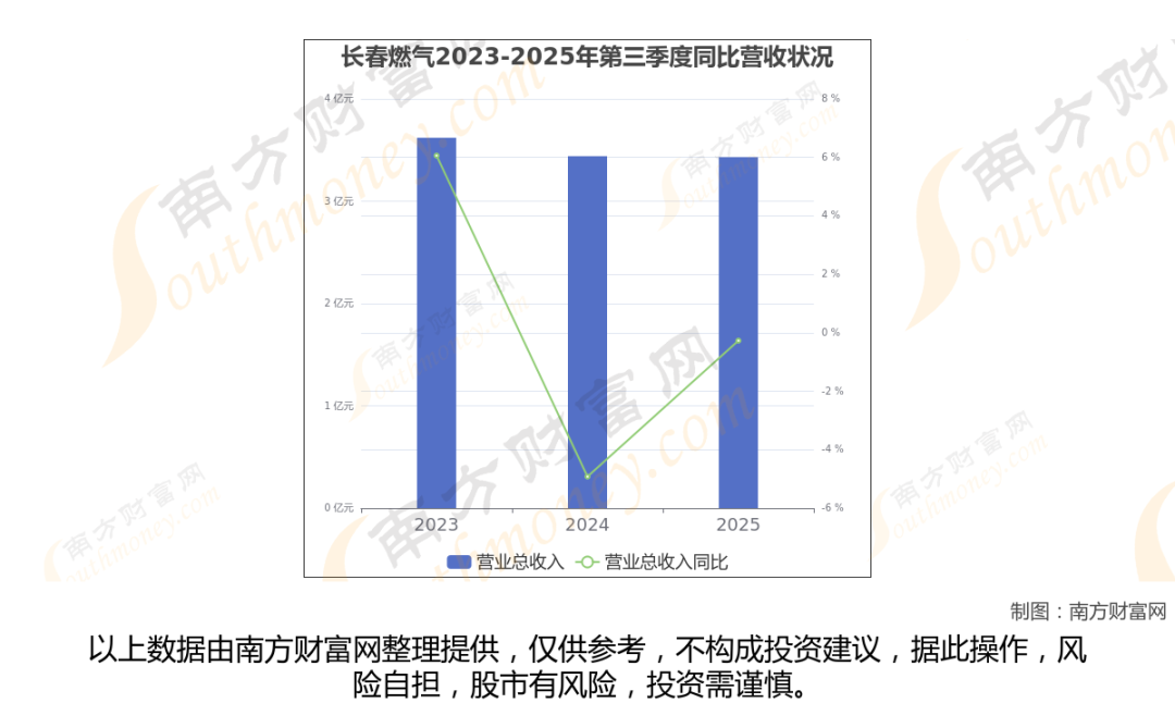 在2025年第三季度,长春燃气的业绩表现(如上图),主营业务收入达到3.43亿元,实现了-0.27%的同比增长率。