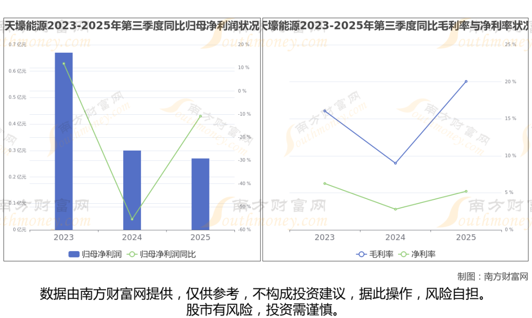 2025年第三季度季报显示,天壕能源公司实现净利润2672.36万,同比增长-10.86%;毛利润为1.14亿,毛利率20.05%。