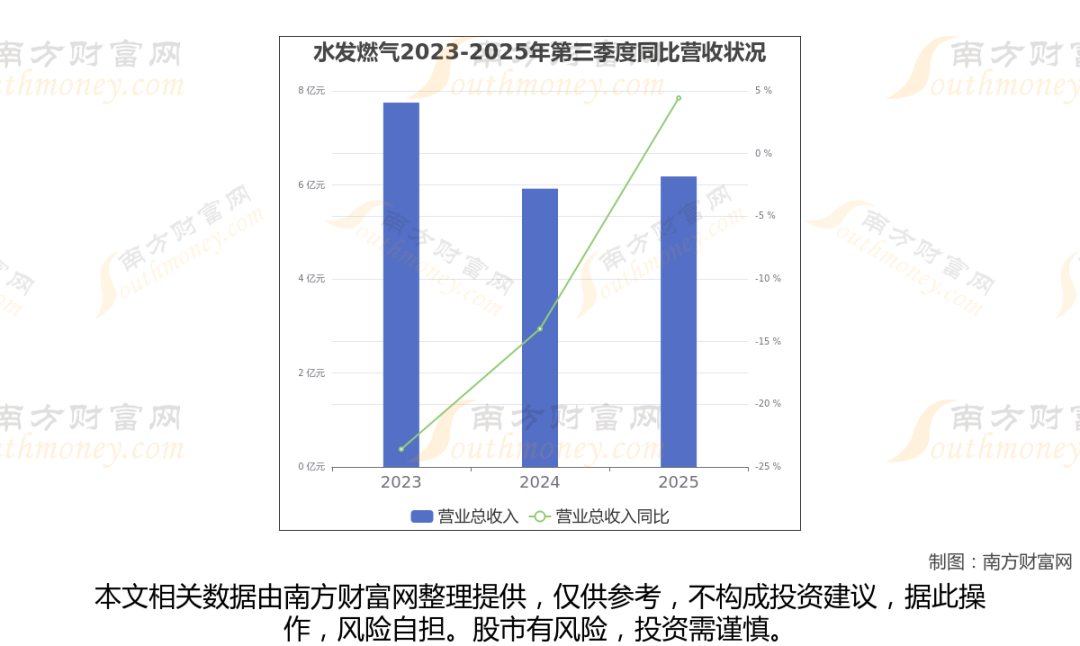 在2025年第三季度,水发燃气的业绩表现(如上图),主营业务收入达到6.18亿元,实现了4.43%的同比增长率。