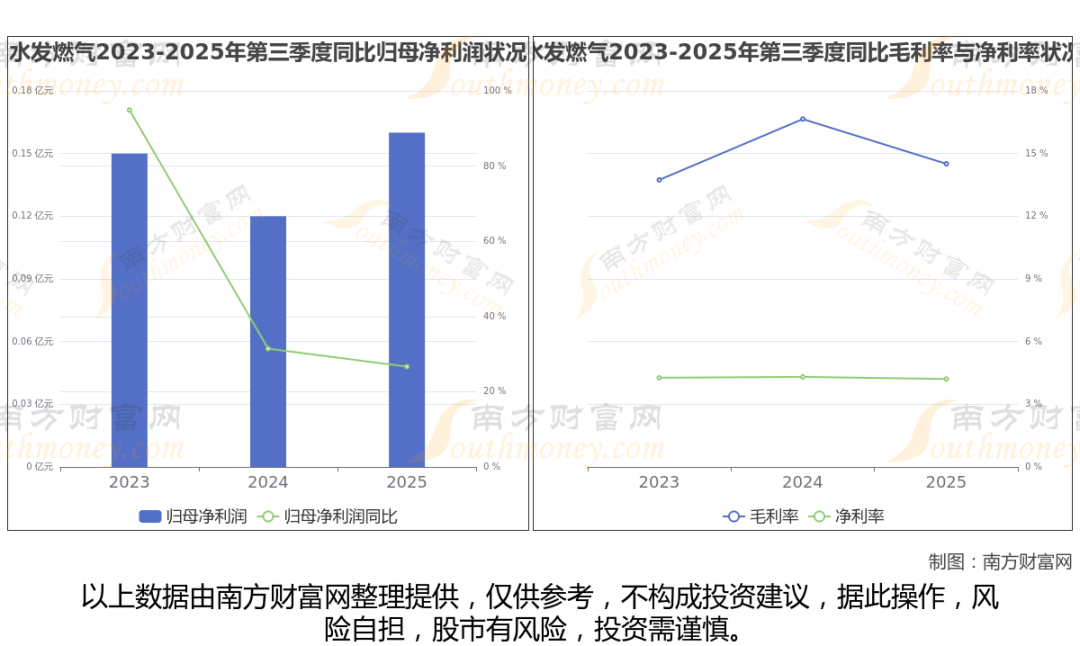 2025年第三季度季报显示,水发燃气公司毛利率14.51%,净利率4.21%,归属净利润1558.8万,同比增长26.68%。