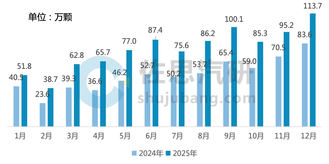 2025年1-12月,中国乘用车新车整体智驾域控SoC安装量达939.4万颗,同比增长51.2%。分月度看,2025年12月,智驾域控SoC安装量创新高,达113.7万颗,同比增长36.0%。其中,合资安装量达29.7万颗,同比增长4.1%,主要受特斯拉、丰田、日产等拉动;自主安装量84.1万颗,同比增长52.5%,主要受比亚迪、方程豹、问界等拉动。