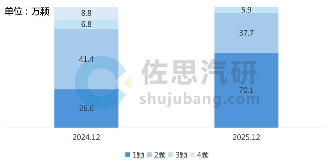分安装颗数看,2025年12月,单颗方案安装量达70.1万颗,占总安装量61.7%,该方案安装量最大的SoC是英伟达Orin-N,安装量达17.3万颗,同比增长1616.1%。2颗方案安装量达37.7万颗,占总安装量的33.1%,该方案安装量最大的SoC是特斯拉二代FSD,搭载车型Model Y、Model 3等。3颗方案安装量达5.9万颗,该方案安装量最大的SoC是英伟达Tegra K1 Mobileye EyeQ3 Altera Cyclone(FPGA)。4颗SoC方案安装量仅为348颗,采用英伟达Orin-X。