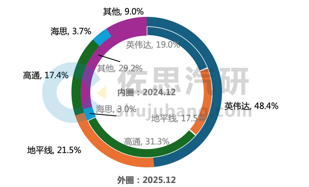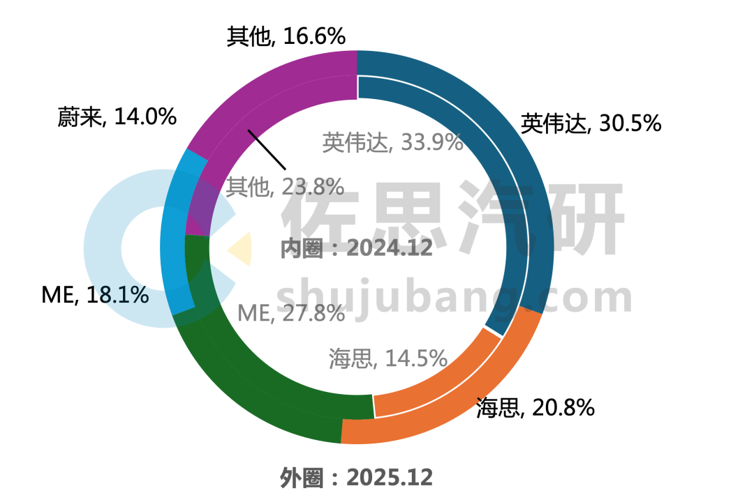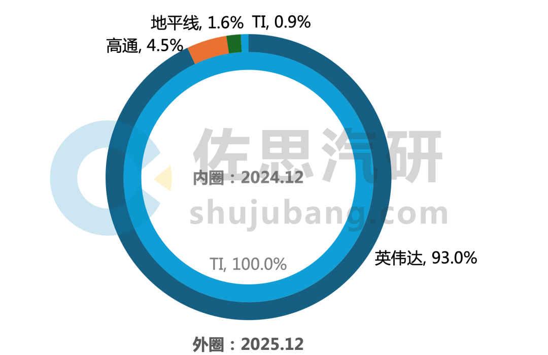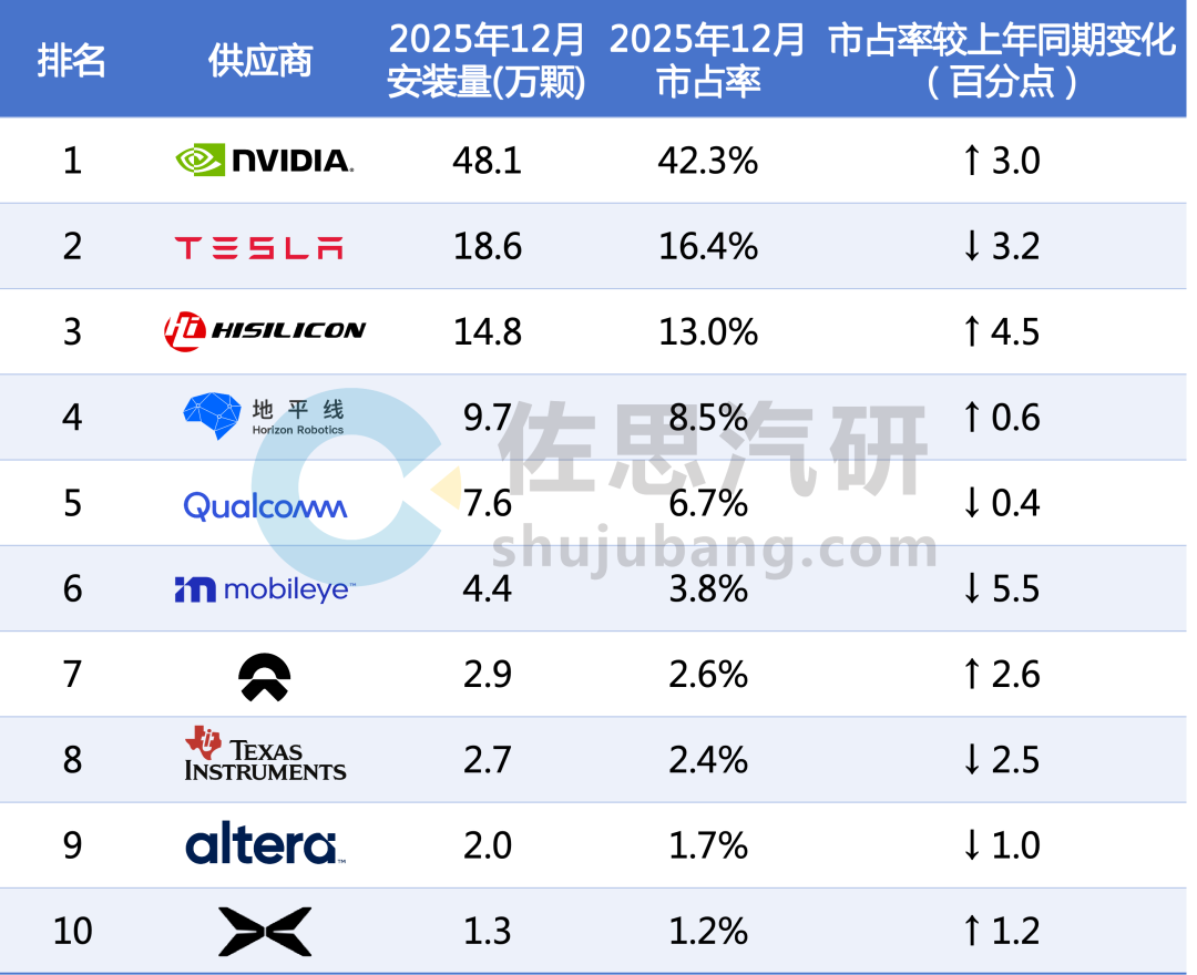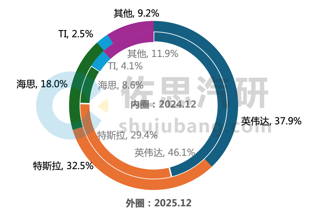 2025年12月,英伟达以42.3%的市占率稳居龙头,较上年同期增长3.0个百分点。特斯拉以16.4%市占位居第二。