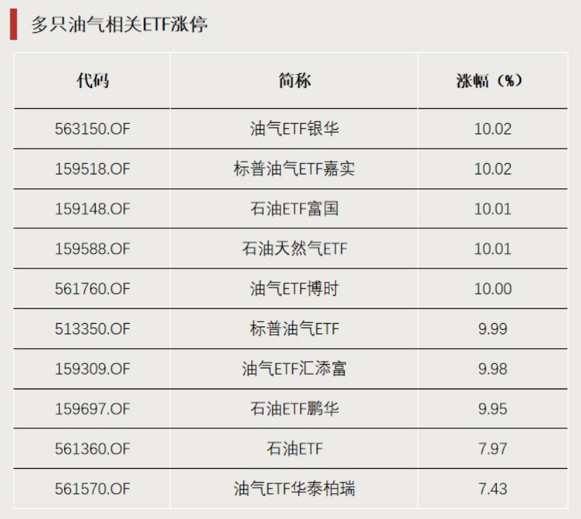 3月3日,油气股再度走强,多只油气相关ETF涨停,涨幅前十的ETF均为油气相关ETF。卫星相关ETF跌幅居前。多只油气相关ETF、石油相关LOF再次发布溢价风险提示公告。南方原油LOF3月3日开市起停牌至10:30,之后复牌,截至午间收盘涨停。该基金于3月3日下午开市起再次停牌至当日收市。3月2日,南方原油LOF涨停。