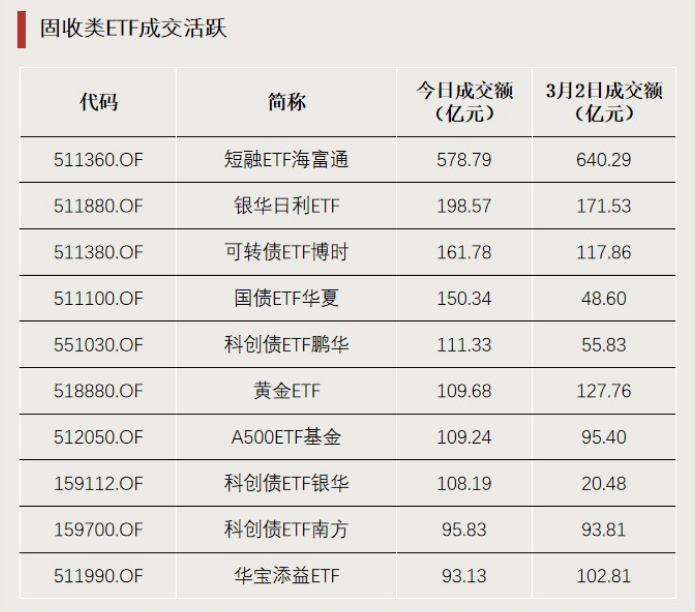 3月3日,油气股再度走强,相关ETF集体大涨。油气ETF银华、标普油气ETF嘉实、石油ETF富国、石油天然气ETF等相关ETF涨停,涨幅前十的ETF再度被油气相关ETF“霸榜”。今日午间,油气ETF华泰柏瑞、标普油气ETF(513350)等多只油气相关ETF发布公告提示溢价风险。南方基金今日午间公告称,南方原油LOF二级市场交易价格明显高于基金份额净值,出现较大幅度溢价。为保护投资者的利益,该基金于3月3日下午开市起停牌至当日收市。今日,卫星主题ETF跌幅居前。多只卫星、航空航天相关ETF跌超7%。今日,韩国股市大跌,境内唯一一只投资韩国市场的ETF——中韩半导体ETF跌近8%。3月3日,ETF成交额合计6482.17亿元。8只ETF成交额突破100亿元。今日,固收类ETF成交活跃,短融ETF海富通成交额近580亿元,可转债ETF博时、国债ETF华夏、科创债ETF鹏华、科创债ETF银华等债券ETF成交额均超过100亿元。黄金ETF(518880)依然成交活跃,继昨日成交额突破100亿元后,今日成交额再度突破100亿元。3月2日,油气相关ETF大涨,也吸引较多资金净流入。石油ETF(561360)、石油ETF鹏华获资金净流入较多。其中,石油ETF(561360)吸金超30亿元。