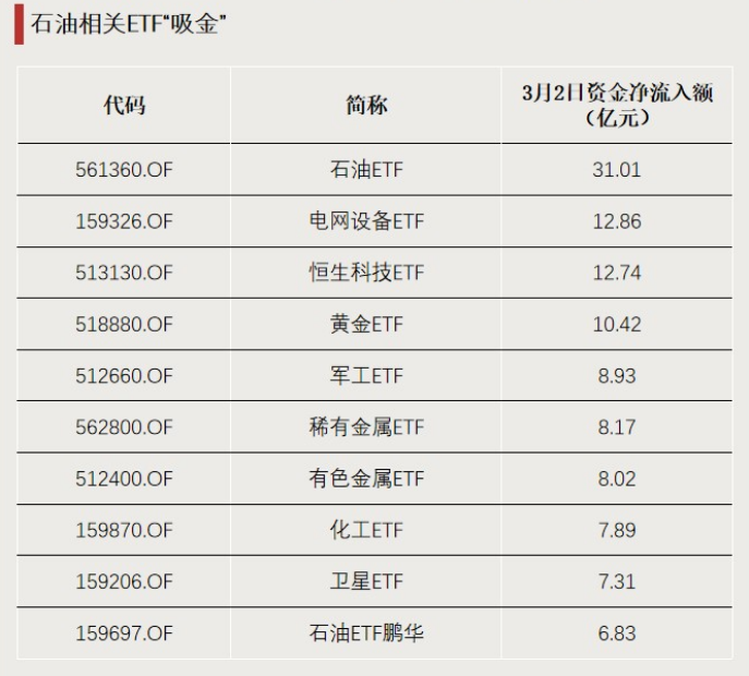 3月2日,油气相关ETF大涨,吸引较多资金净流入。石油ETF(561360)吸金超30亿元。
