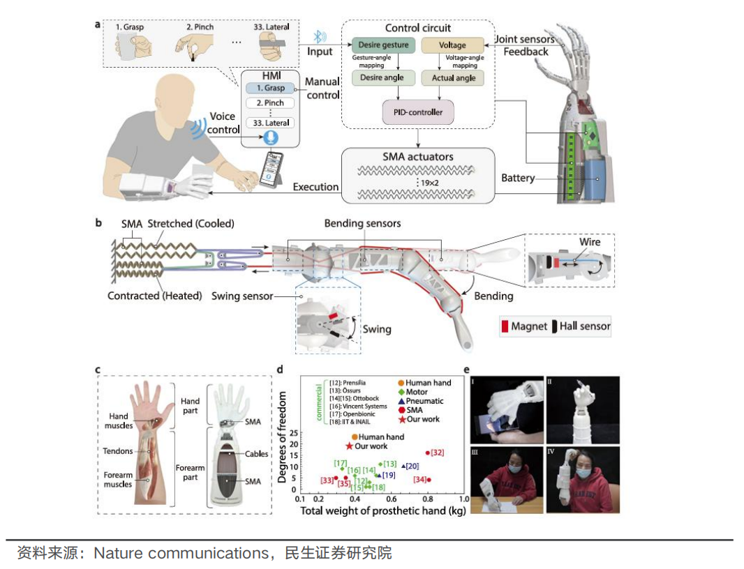 SMA方案可满足超小型场景需求,但存在滞后反应、寿命较短等问题。形状记忆合金(SMA)可记住自身形状,当其被加热到特定温度时,可以恢复到原始形状。SMA丝/弹簧驱动单元可微型化至毫米级,在微创手术器械、软体机器人等超小型场景中均适用。且五电机驱动方案中的机械传动部件,适用于安静环境(如实验室精密操作)。同时,SMA材料对温度控制要求极高,加热/冷却循环响应慢(秒级)会使其动态性能受限,需配备精准的温控系统,且其寿命较短,反复相变会导致材料晶格损伤。