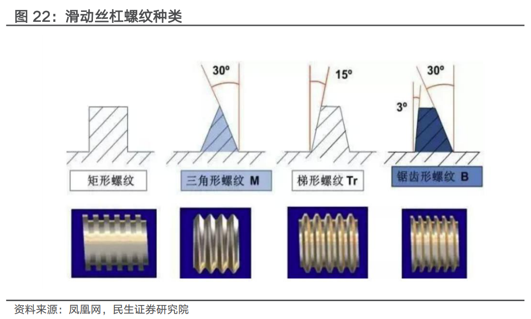 滑动丝杠通过滑动摩擦实现直线传动。滑动丝杠传动采用滑动丝杠轴和螺母螺纹,两者之间没有滚珠轴承,螺母和丝杠轴在较大的接触面积上直接相互移动。按照螺纹种类划分,可分为梯形螺纹、锯齿形螺纹、矩形螺纹等,梯形螺纹加工工艺更具优势,加工效率较高,较三角形等其他种类更为主流。