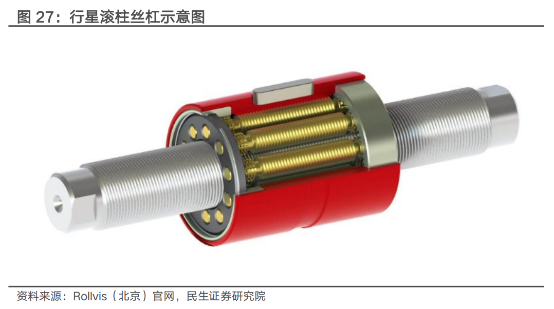 行星滚柱丝杠优点较多,但需兼顾效率、成本之间的衡量。相较于滚珠丝杠传动方案,行星滚柱丝杠方案承载力、体积、精度等综合优势凸显,但行星滚柱丝杠优异性能的背后支撑是极高的工艺要求和设备壁垒。1)工艺壁垒:行星滚柱丝杠螺母的内螺纹加工是核心壁垒所在,制造工艺难度较大,人形机器人远期需求较大,对于零部件公司的批量生产能力和一致性保持能力同样提出较高要求。2)设备壁垒:行星滚柱丝杠的高精度特性对设备要求高,国产磨床加工精度不及进口磨床,出品易不稳定,因此目前高端加工设备依赖进口,但海外高端磨床成本更高且采购周期偏长。