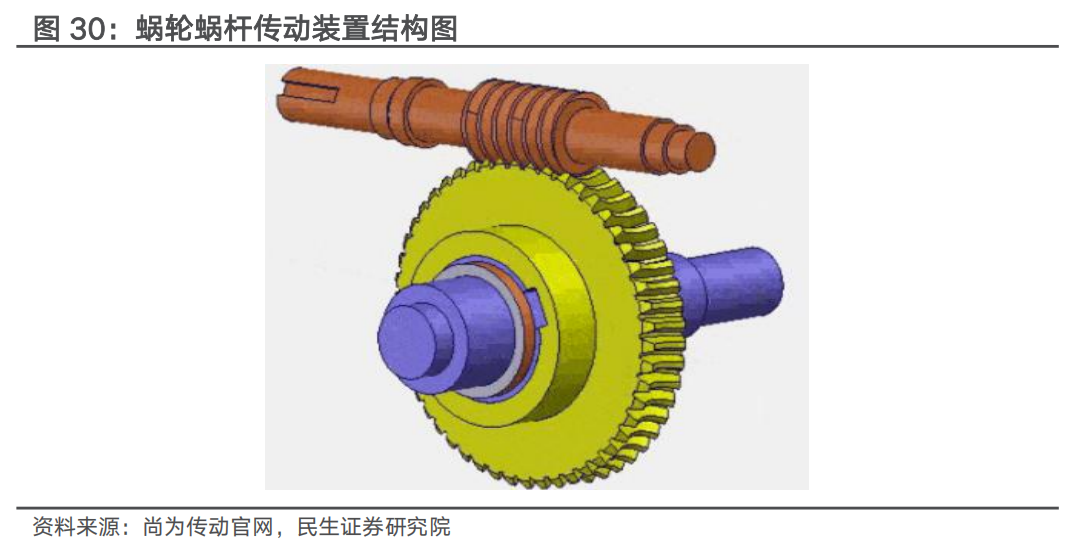 蜗轮蜗杆传动装置:常用来传递两交错轴之间的运动和动力。蜗轮蜗杆机构通常两轴交错角为 90°,一般是以蜗杆为主动件,工作时蜗轮轮齿沿着蜗杆的螺旋面作滑动和滚动。