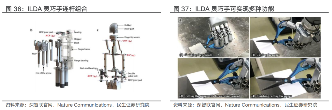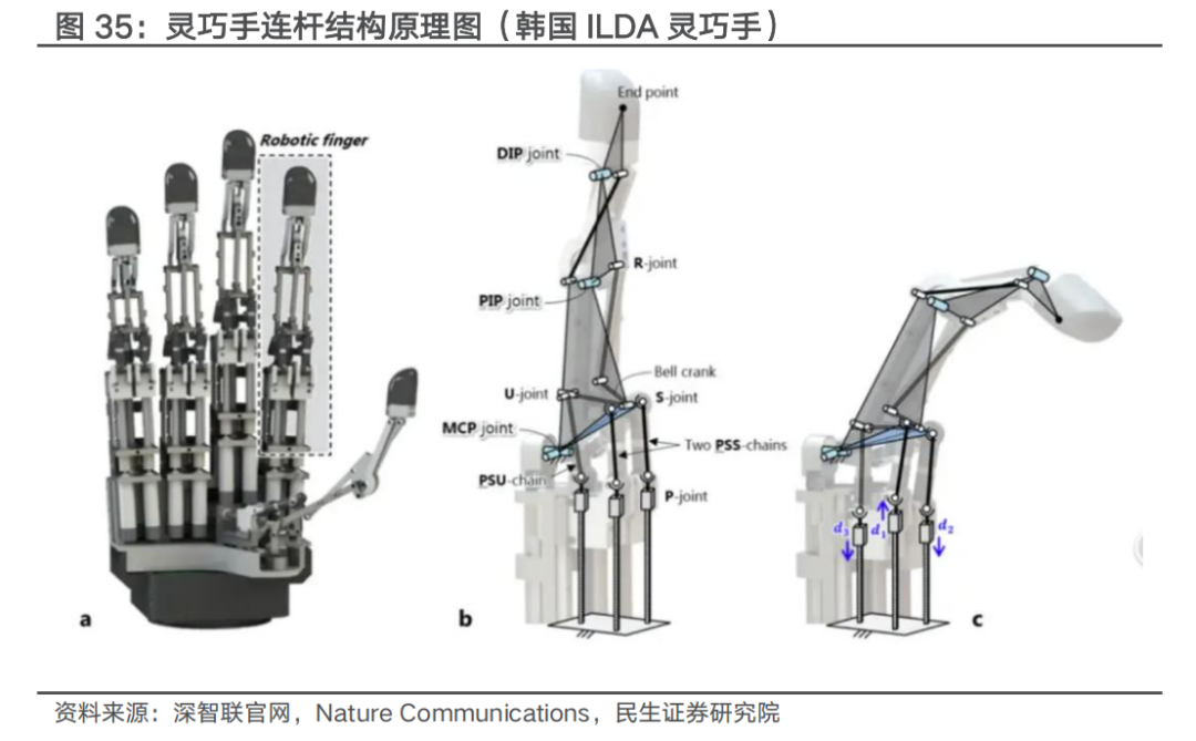 连杆机构定位精度更高、低成本,但不适用于高自由度场景。多连杆方案可通过并联或串联方式实现传动,ILDA灵巧手连杆方案通过并联和串联机构的融合构建,通过连杆组合实现掌指关节(MCP)的2自由度运动和近端指间关节(PIP)的1自由度运动。通过多杆并联结构可提升整体刚性,且相较于腱绳方案,连杆结构重复定位精度更高,无柔性件磨损故使用寿命更具优势。