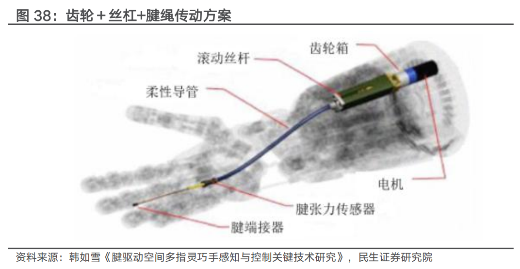 多传动方案配合可发挥多重优势。丝杠传动、齿轮传动、腱绳传动、连杆传动等都各自具备优势和不足之处,主流人形机器人厂商已采用多方案配合形式,在最新的技术演进中,以特斯拉Opimus发布会展示的22自由度灵巧手为例,创新性采用了“行星齿轮箱 丝杠 腱绳”结构。下图所示为多传动形式配合方案,在灵巧手的结构设计中,柔性导管的一端固定在驱动器外壳上,另一端与固定在灵巧手手掌前端的腱张力传感器上。腱由驱动器内部活滚珠丝杠上的螺母拉动,穿过导管和腱张力传感器,连接在手指关节部分。