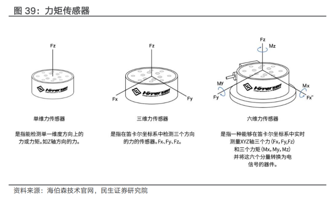 力/力矩(F/T)传感器:能感知力、力矩并转换成可用输出信号。力/力矩传感器可实现指尖力检测(测量抓取物体时的接触力,防止过压或滑脱)及关节扭矩反馈(实时监测关节驱动扭矩,优化控制算法)。按测量维度,力矩传感器可分为一维至六维力矩传感器,六维力传感器可同时测量3个力分量和3个力矩分量,是最完整的多维力传感器形式,技术难度、行业壁垒均最高。