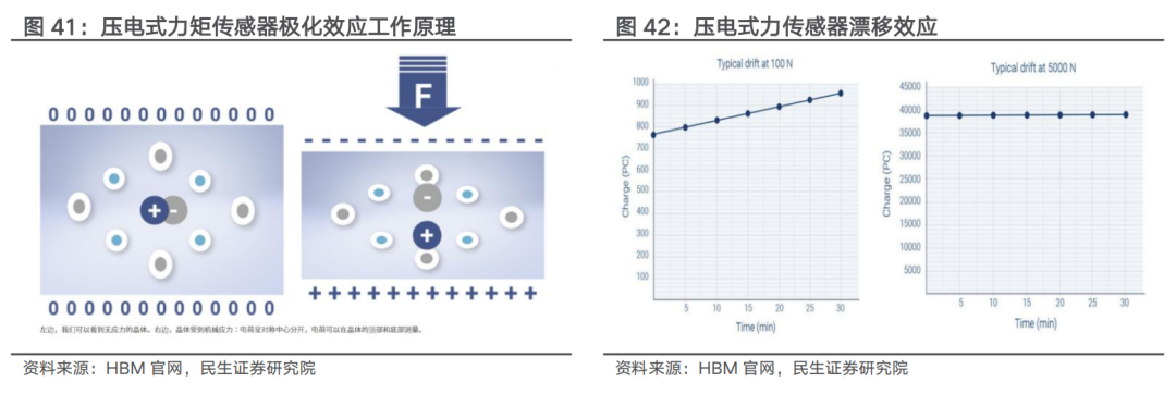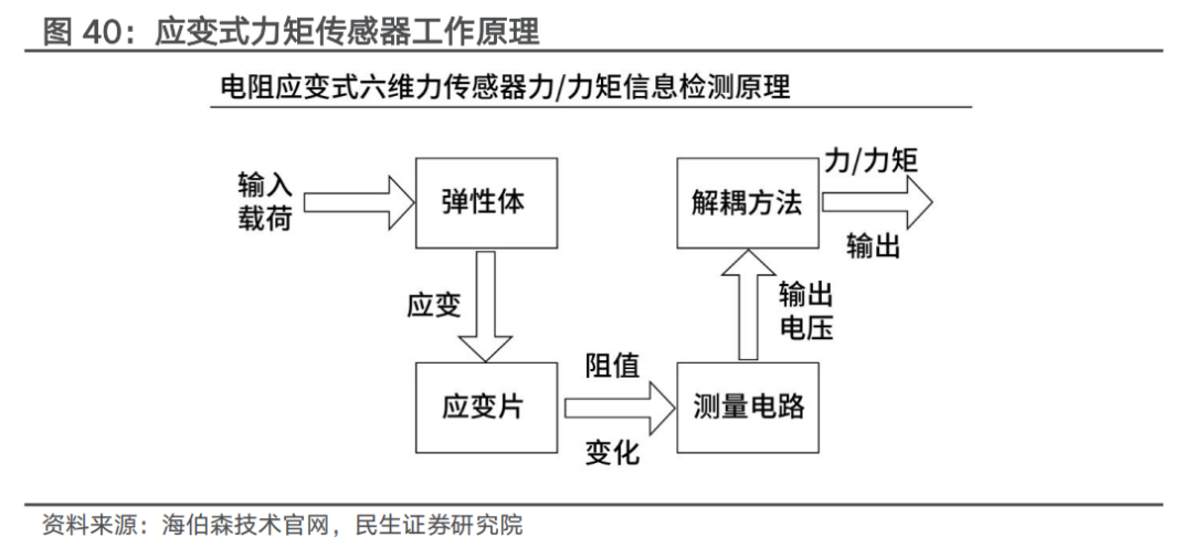 六维力传感器通常基于应变效应工作。六维力矩传感器可感知三个力 三个力矩,是目前最完整的多维力传感器形式,为机器人提供了类似于人类触觉的功能,是机器人柔顺控制和操作的核心部件。六维力传感器通常基于应变效应工作,即通过弹性体上的应变片来检测力或力矩引起的微小形变。部分灵巧手厂商也采用压电式力传感器(借助极化效应,体积小、重量轻),工作频带宽,具备高频响特性,适用于动态力检测(如碰撞),但需定期校准,且成本较高(材料必须具有高质量、精确和均匀的表面)且更容易漂移。