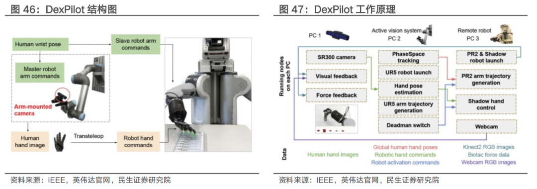视觉传感器:借助摄像头等可实现较为复杂的人机交互。人类学习利用视觉来对手的运动进行规划、控制、状态态预测是先于精确的手控制的,遥操作系统能够利用人类的能力仅通过视觉来进行物理里操作的规划、运动、预测。英伟达DexPilot借助4个Intel RealSense相机实现低成本的遥操作系统,可完成多种物理任务。