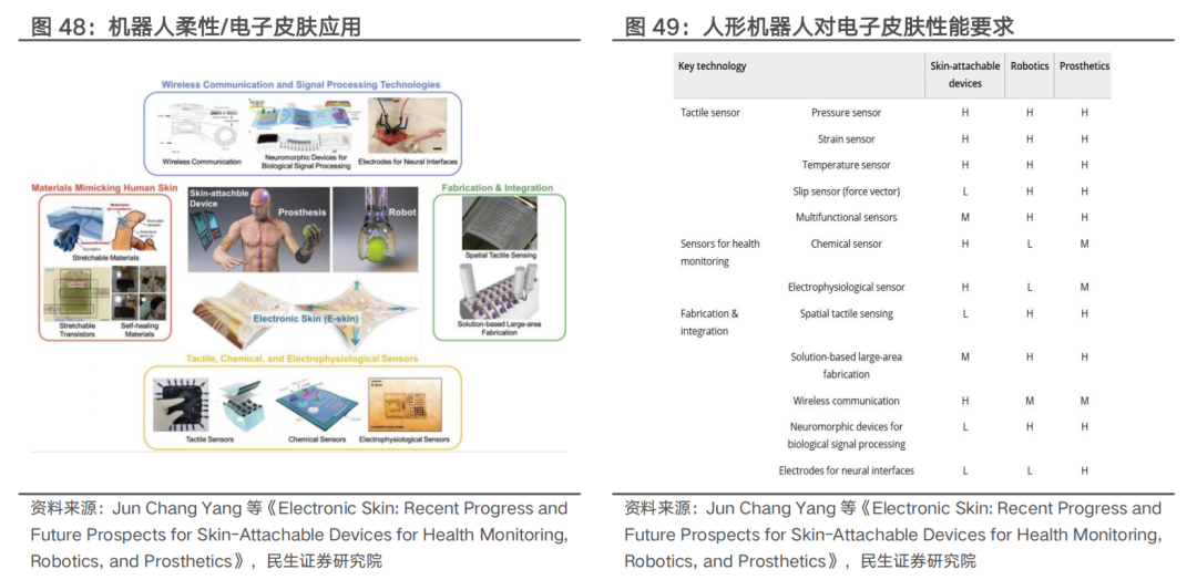 柔性/电子皮肤传感器是机器人传感器的升级版本。电子皮肤为具备仿生性、柔弹性的传感器,借助触觉单元的阵列与集成模仿人类皮肤完成力/力矩、触觉等感知。柔性触觉传感器主要由基底材料、电极材料、功能层材料构成。基底材料决定传感器弹性形变性,电极材料主要用于传输电信号,功能层材料将外部的力、温度、湿度等物理量转化为电信号。机器人电子皮肤前沿企业技术大多来源于全球知名高校,技术仍处于偏早期阶段。