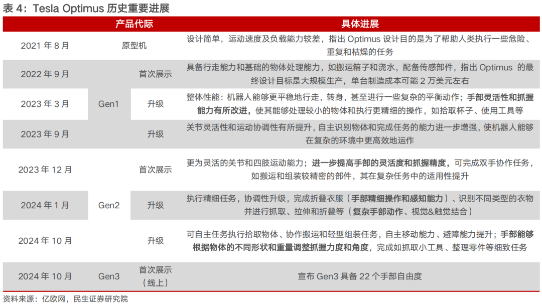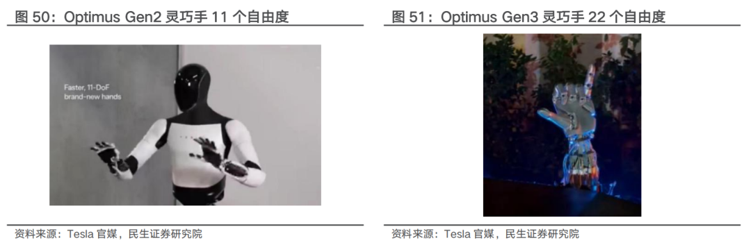 ■ 特斯拉Optimus代际更迭中灵巧手自由度不断提升。复盘特斯拉Optimus多代际产品的更新进程,灵巧手的灵活度、精密操作性不断提升。2024年10月,特斯拉已官宣相较于上一代Gen2,第三代Optimus灵巧手已具备22个自由度,较上一代翻倍,我们预计各环节尤其是驱动系统部件个数有望提升。