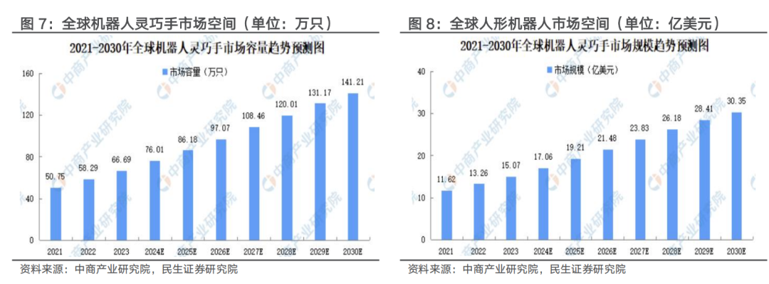 参照中商产业研究院数据,2024年全球机器人灵巧手市场规模约76万只/17亿美元,至2030年全球机器人灵巧手市场规模将突破141万只/30亿美元。