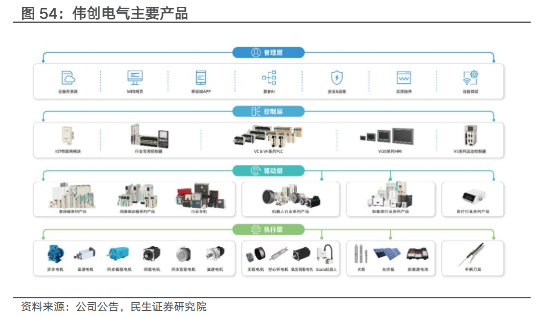 自动化控制产品线完备,机器人赛道加速布局。公司产品涵盖通用变频器、伺服系统、PLC&HMI、工业机器人、高性能电机、精密机械(丝杠、直线导轨)、气动等产品及解决方案。公司多项产品如通用伺服、低压变配、小型PLC等产品份额均位居行业前二;工业机器人、SCARA机器人份额分别位居第三、第一。
