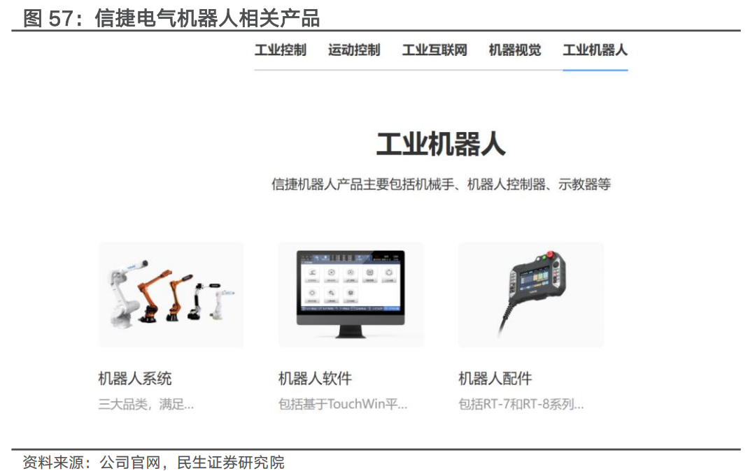产品线已逐步完善,机器人赛道成长性可期。公司小型PLC产品已居内资龙头地位,通过不断下延布局,公司目前产品线已贯穿人机交互(HMI)、控制系统(PLC)、驱动系统(伺服驱动系统,变频器)、执行反馈机构(伺服电动机,交流电机)、以及输出(工业机器人)的全过程。公司目前已具备机器视觉、SCARA 机器人、六轴机器人、以及相应的机器人控制系统并形成收入。