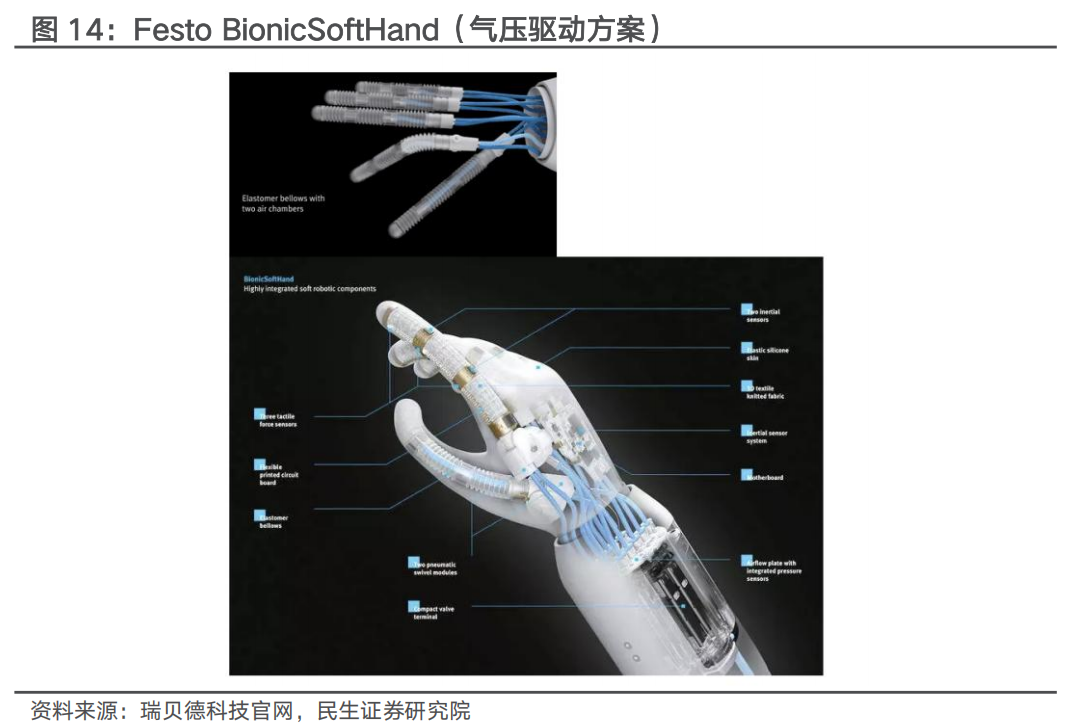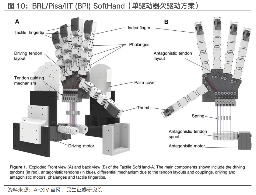 欠驱动方案控制精度降低,但体积、成本等性能有所提升。欠驱动灵巧手的驱动源数量少于自由度,在牺牲控制精度的情况下实现更优的体积、重量、成本,应用更为广泛。BRL/Pisa/IIT (BPI) SoftHand采用欠驱动方案,借助单个执行器 肌腱驱动,低成本设计。该方案中,欠驱动的机械特性能够使得手指自动适应物体的形状,具备很好的形状自适应性,且绝大多数手指关节都具有自由运动的柔性,抗外界冲击性较强。