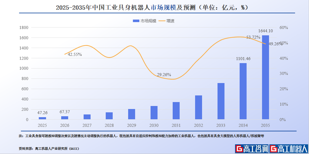 “不具身,无未来”正成为机器人行业的共识。据GGII数据,2025年我国工业具身机器人市场规模约47.3亿元,而到2035年,这一数字有望达到1644.1亿元,年复合增长率高达42.3%。