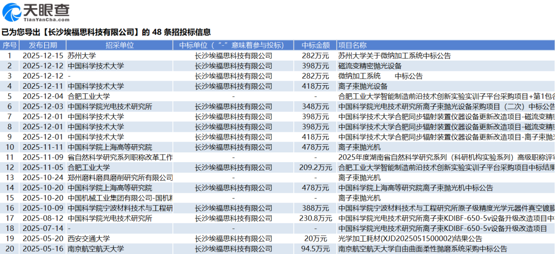 此外,时代周报记者通过天眼查发现,仅2025年埃福思就中标了多家高校的采购项目,包括南京航空航天大学、西安交通大学、中国科学院光电技术研究所、合肥工业大学、中国科学技术大学、苏州大学等。