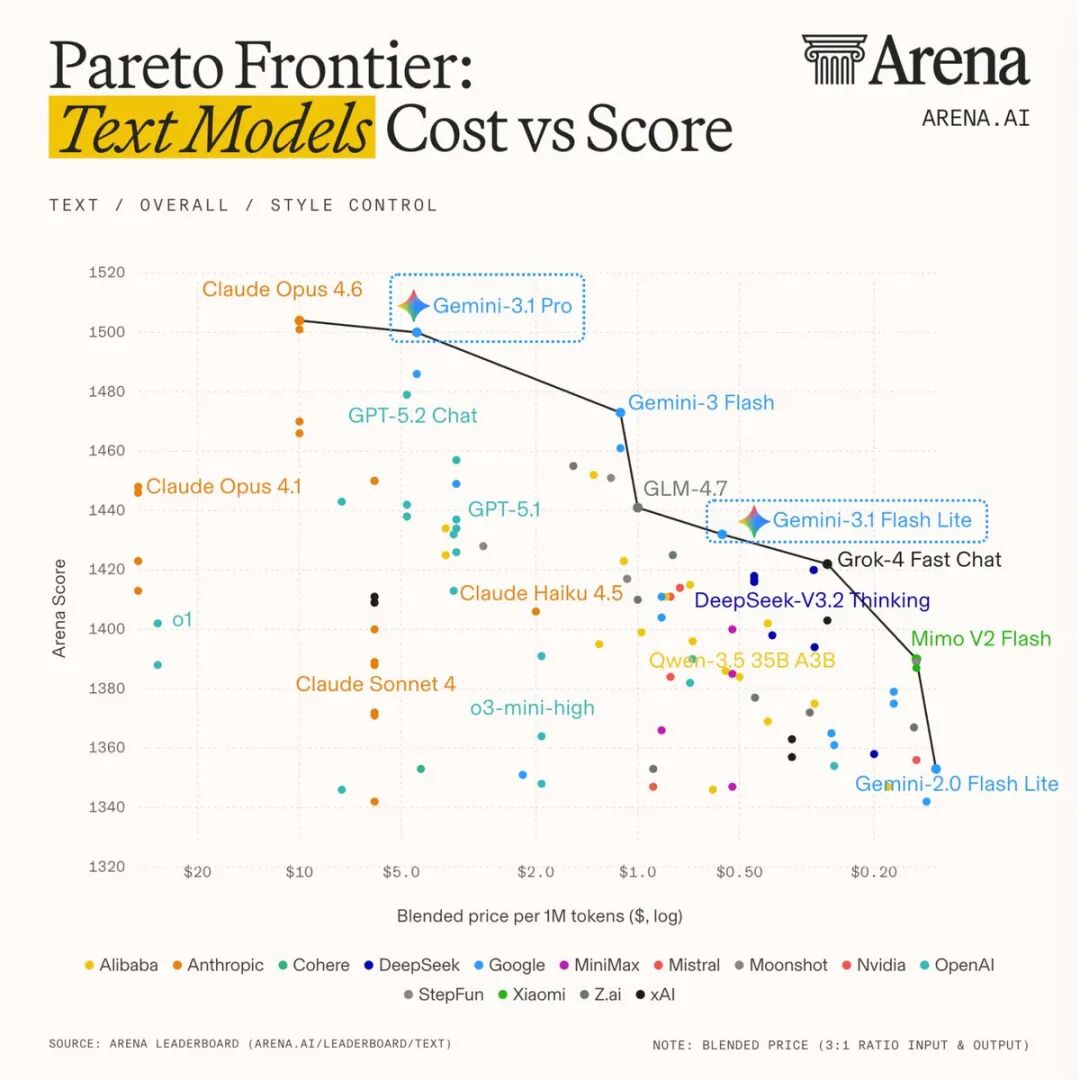 而Gemini-3.1 Pro则持续在高价位型号中保持第一梯队,Gemini 3 Flash处于二者之间。