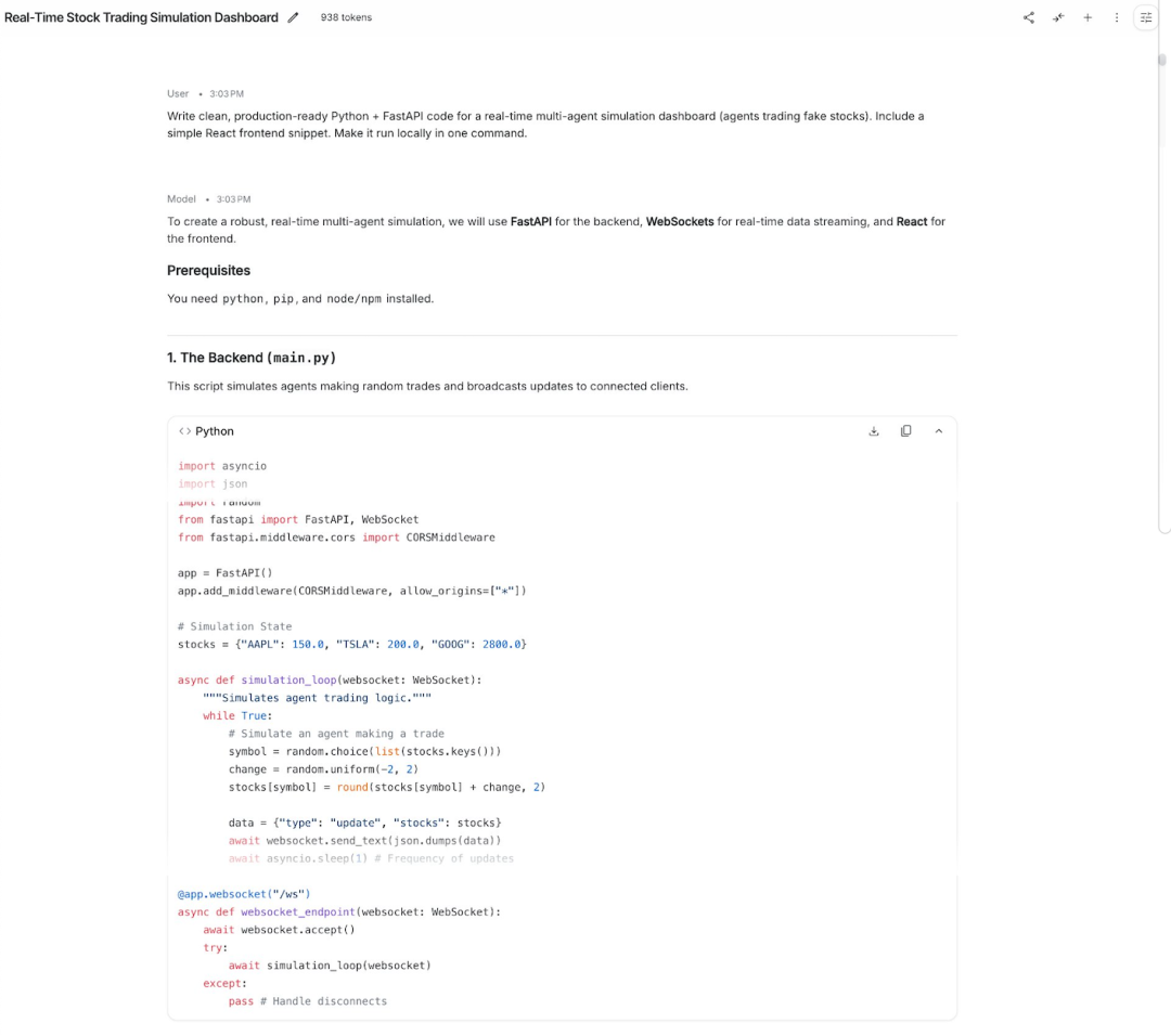 在编程测试中,Gemini 3.1 Flash-Lite输出简洁直接,没有做复杂的项目拆分,以单文件实现了核心后端功能,可快速运行,无冗余内容。