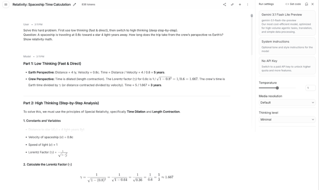 Gemini 3.1 Flash-Lite正确使用了复杂物理学公式,回复结构也很完整,先给简要结论,再进行明确的数学推导。