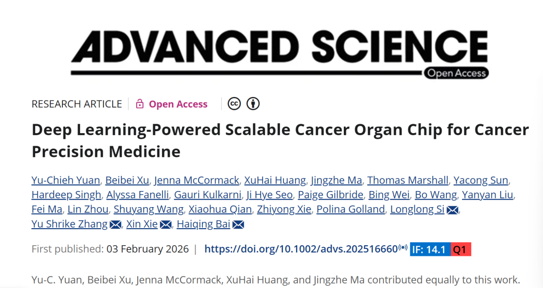 Yuan YC, Xu B, McCormack J, et al. Deep Learning-Powered Scalable Cancer Organ Chip for Cancer Precision Medicine. Adv Sci (Weinh). Published online February 3, 2026. doi:10.1002/advs.202516660