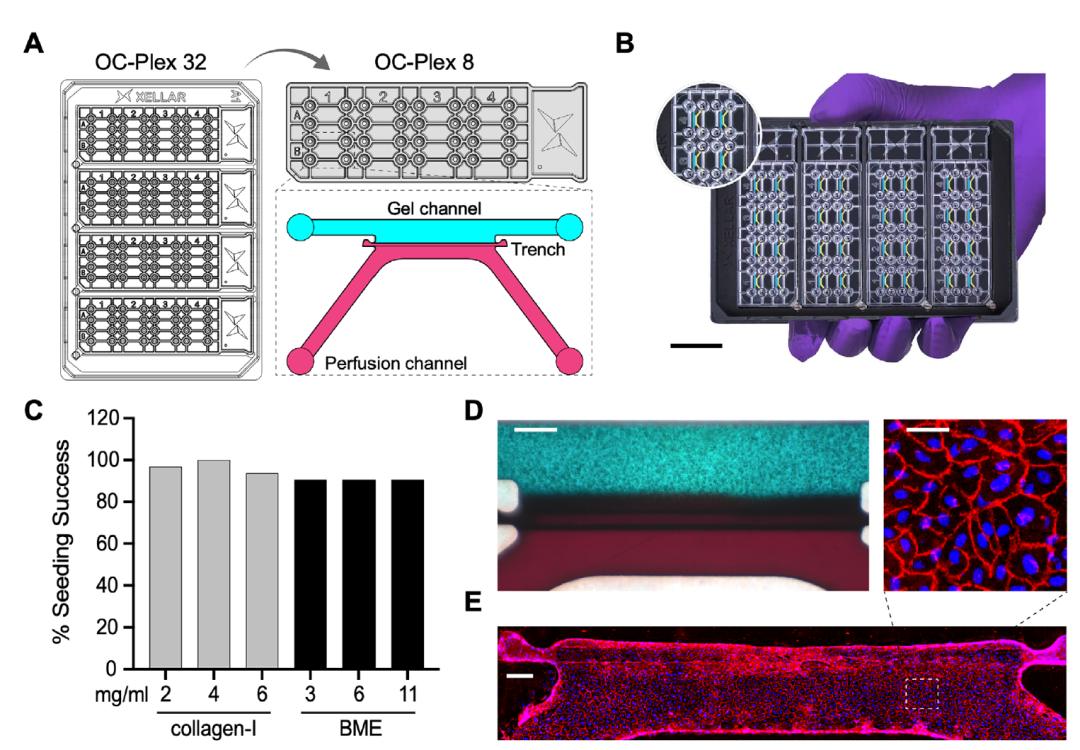 同时,该平台具备极强的兼容性和可扩展性,不仅支持组织特异性细胞外基质培养,还能通过恒流、重力驱动等多种灌注模式实现细胞共培养,成像兼容性优异。4个基础版OC-Plex 8可组合为OC-Plex 32高通量版本,完美适配主流自动化成像系统,水凝胶填充成功率超90%,还能在灌注通道接种内皮细胞形成血管化小管,构建出更贴近体内生理状态的肿瘤微环境,为药物检测提供了更精准的模型基础。