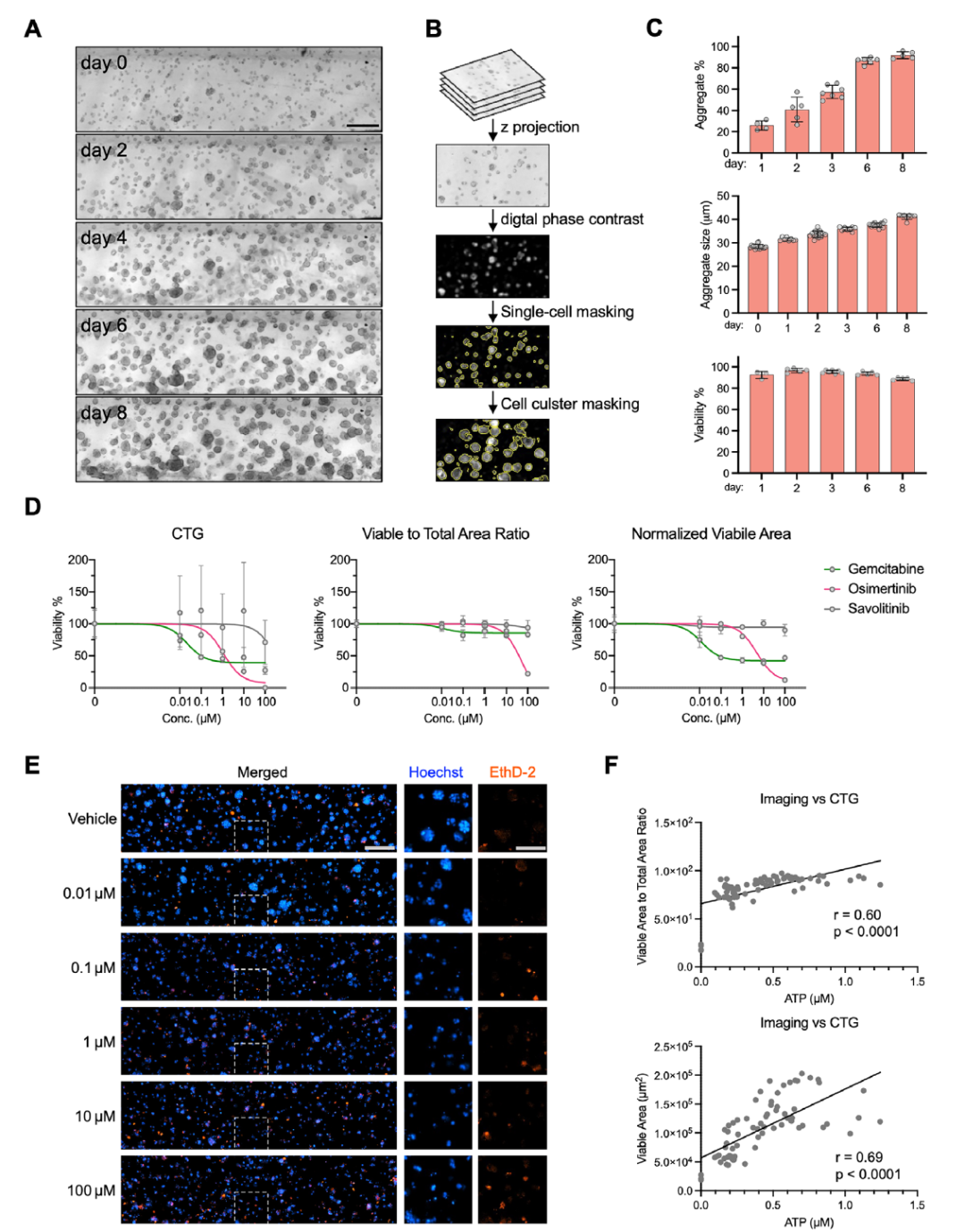 研究团队首先验证了OC-Plex对多种肿瘤细胞的生长支持能力,在胰腺导管腺癌、肺癌、结直肠癌等常见肿瘤细胞系的测试中,该芯片均能有效支持细胞生长、球形成型、细胞迁移,且在静态和动态灌注条件下均能维持细胞高活力,实现长达15天的稳定培养。同时,研究建立了基于成像的表型分析流程,对比传统的CellTiter-Glo ATP检测法,成像分析获得的标准化存活面积等指标,在量化药物效应时不仅能呈现一致的药物敏感性趋势,还具有更小的数据变异,检测的准确性和稳定性显著更优。