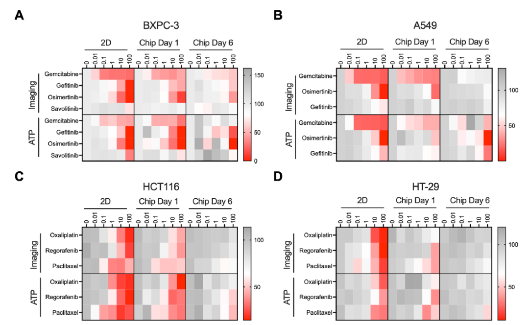 图3:不同肿瘤细胞系在2D培养和OC-Plex芯片模型中的药物敏感性热图