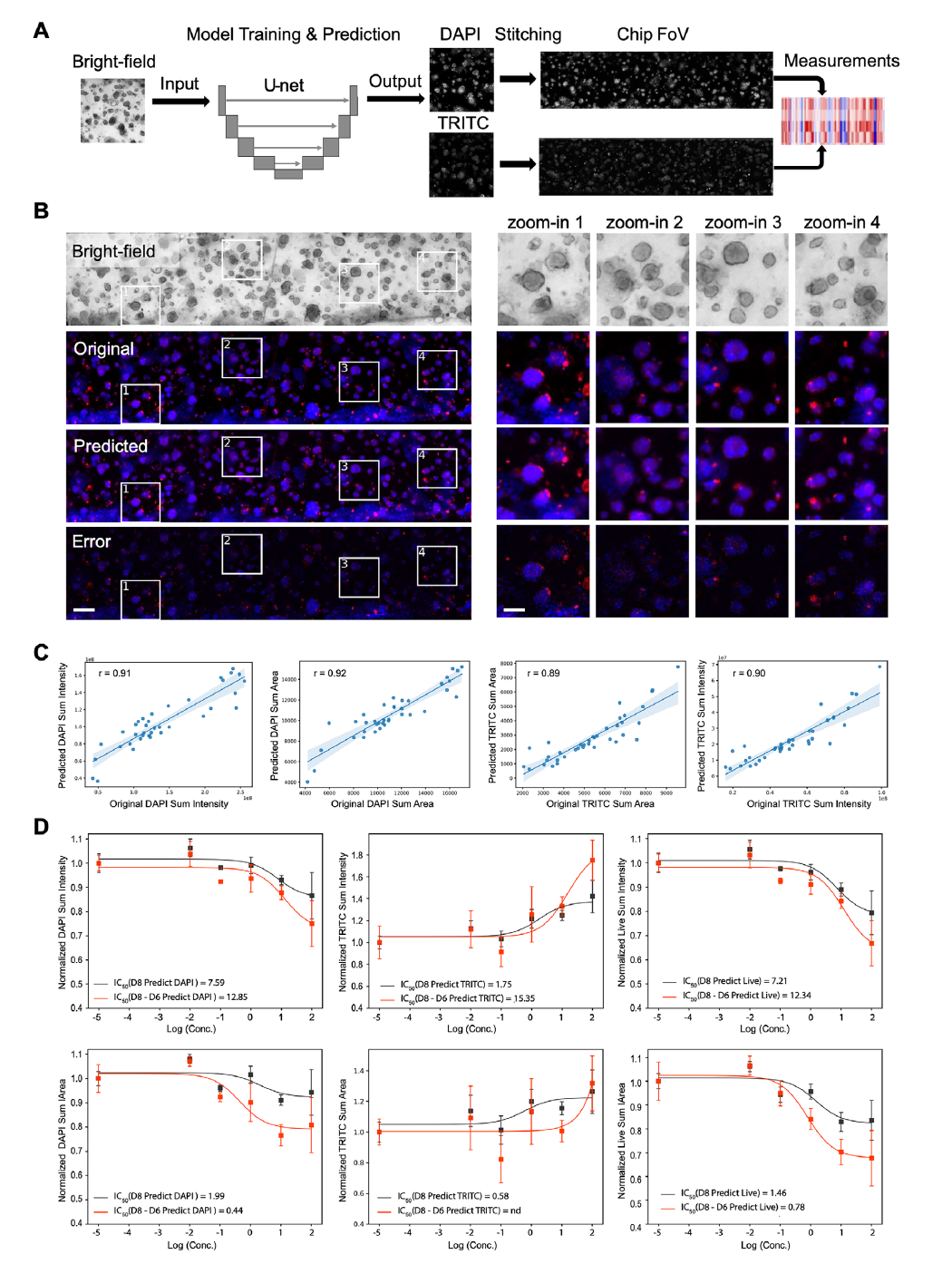 为解决传统荧光染色操作繁琐、存在光毒性、易改变细胞行为且只能实现终点检测的问题,研究团队还为OC-Plex整合了基于U-net卷积神经网络的深度学习图像翻译模型,成功实现从明场图像到荧光染色图像的精准预测,皮尔逊相关系数达0.89-0.92,能有效提取荧光特异性信息。