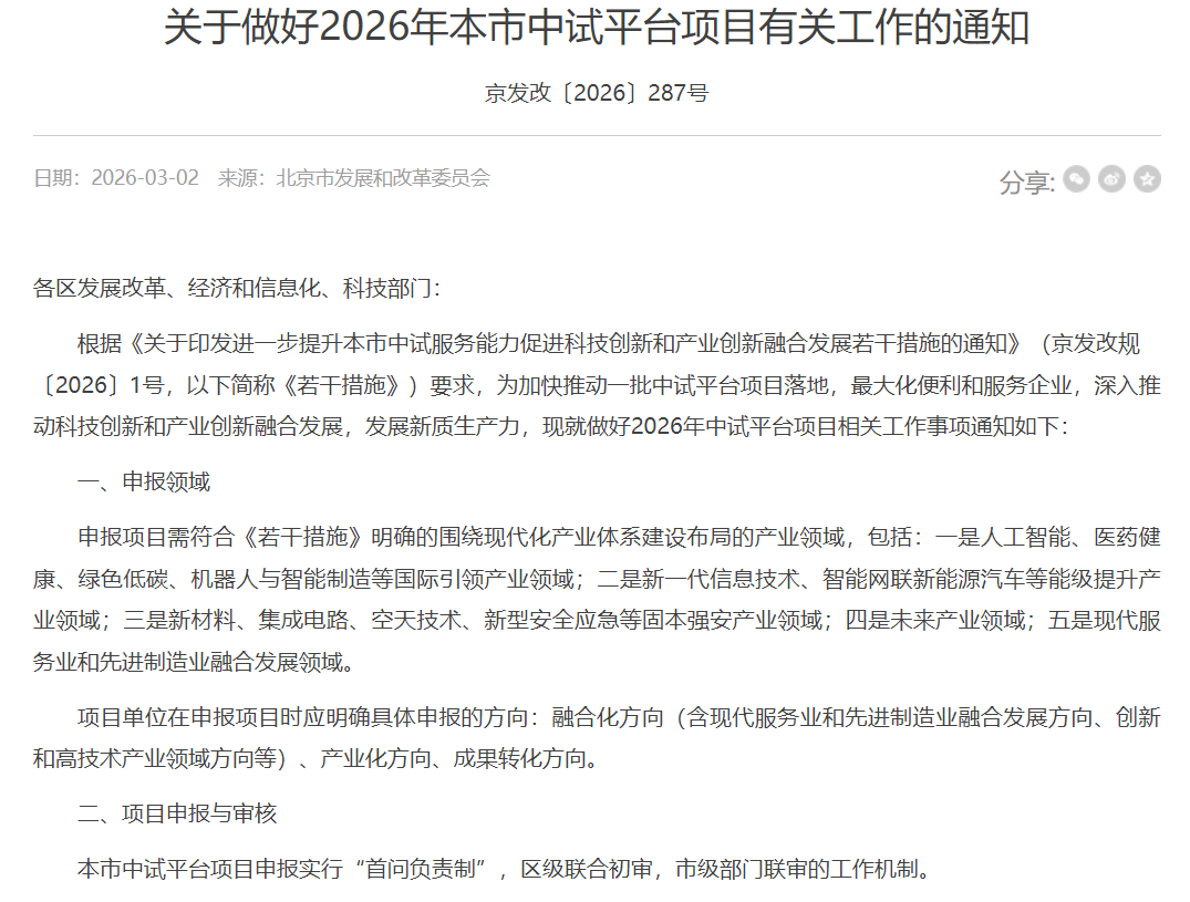 【智能化】北京启动2026年中试平台申报,智能网联汽车列为重点支持方向