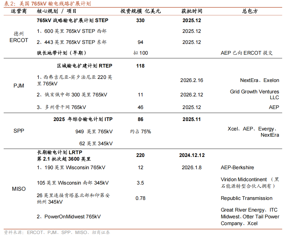 美国启动765kV超高压线路建设,增强电网可靠性及长期系统稳定性。765kV是美国最高的输电电压等级,主要线路分布在东部互联电网,长度仅约2000英里。2025年底以来,德克萨斯州、中大西洋及中西部地区电网运营商相继获批了总计约750亿美元的输电扩容项目,其中765kv线路是建设重点,预计将扩至10000英里。该扩建计划旨在缓解现有基础设施的拥堵,将新发电资源整合进电网,增强电网可靠性及长期系统稳定性。