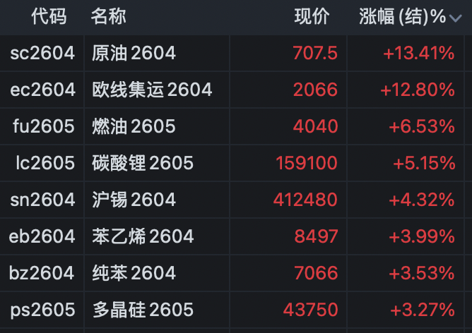 国内期货市场开盘,主力合约多数上涨。上期所原油期货主力合约涨超13%,报707.5元/桶。欧线集运主力合约大涨12.8%。燃油、碳酸锂、沪锡、苯乙烯、纯苯、多晶硅等涨超3%。
