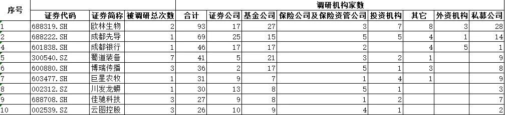 机构调研川股前十名情况,数据来源:Wind