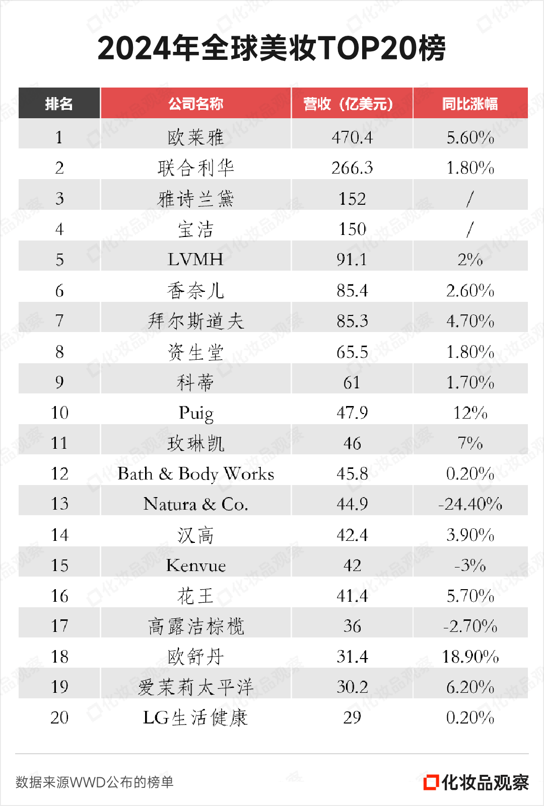 《化妆品观察》了解到,在WWD发布的2023年及2024年度全球美妆企业百强名单中,Bath & Body Works分别排名第11位及第12位。2024年,其美妆营收达到45.8亿美元(约合人民币315.62亿元)。