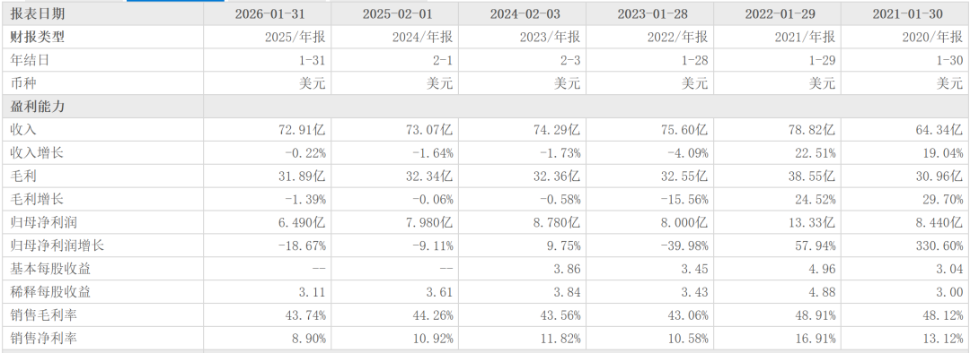 2025财年,其归母净利润为6.49亿美元,较上年减少1.49亿美元(约合人民币10.27亿元)。